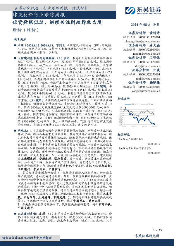【东吴证券】【20240819】建筑材料行业跟踪周报:投资数据低迷,继续关注财政释放力度-25页
