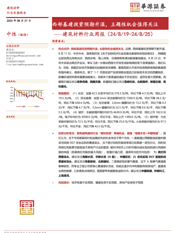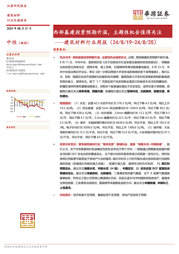 【华源证券】【20240827】建筑材料行业周报:西部基建投资预期升温,主题性机会值得关注-12页