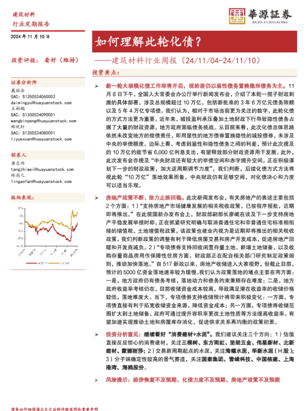 化债政策 建筑材料 房地产政策 行业周报 财政刺激