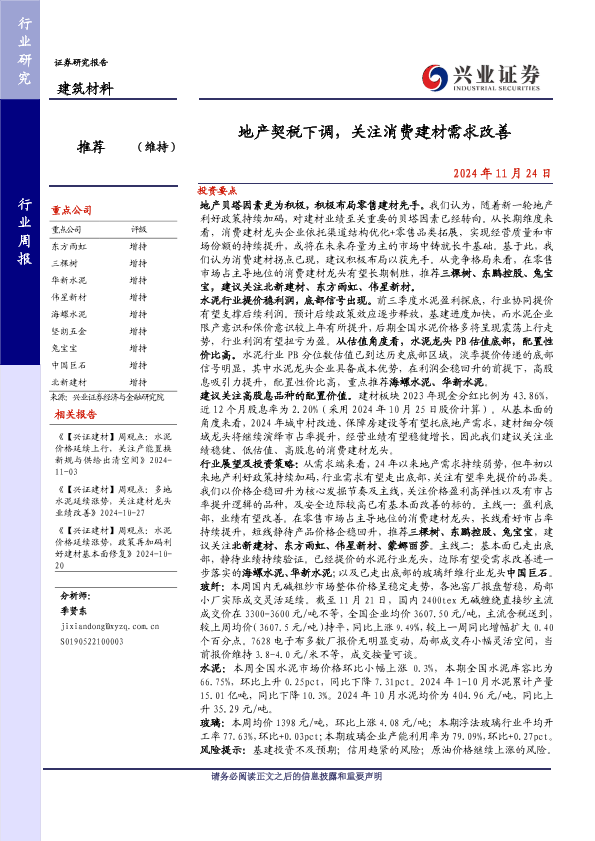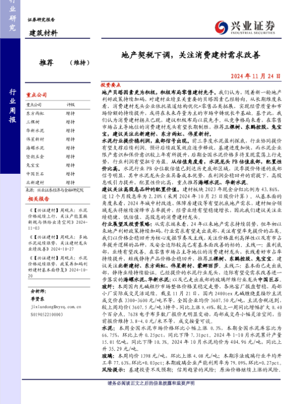 【兴业证券】【20241124】建筑材料行业周报:地产契税下调,关注消费建材需求改善-22页