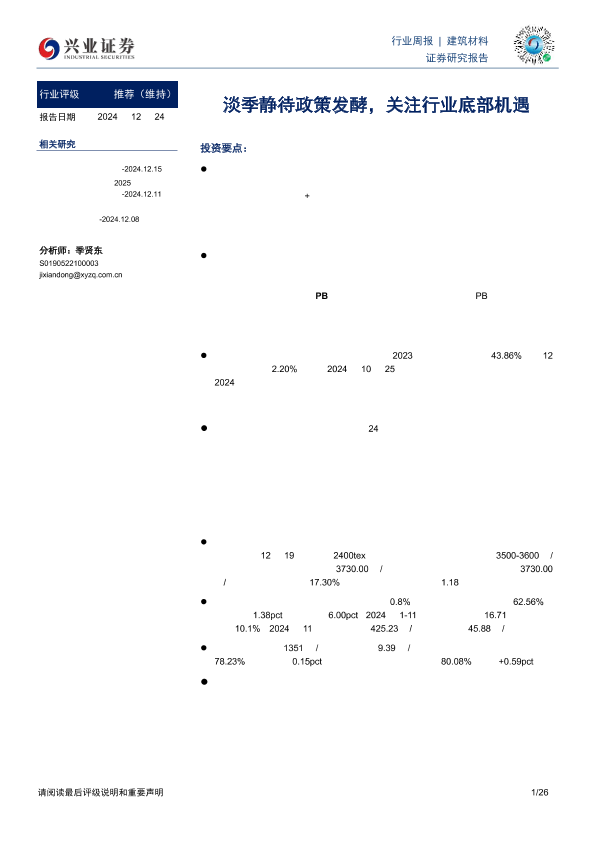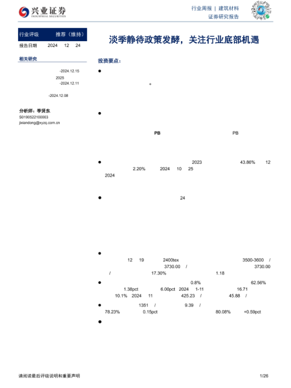 【兴业证券】【20241224】建筑材料行业周报:淡季静待政策发酵,关注行业底部机遇-26页