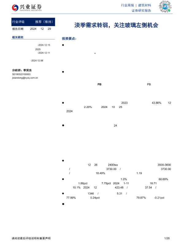 【兴业证券】【20241229】建筑材料行业周报:淡季需求转弱,关注玻璃左侧机会-26页