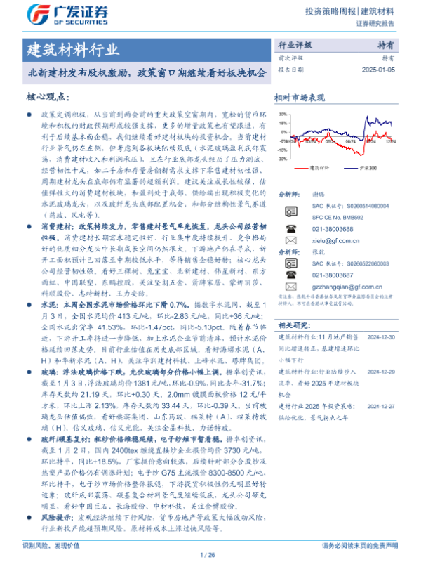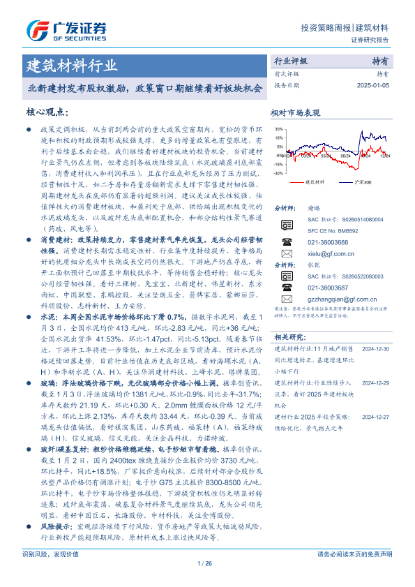 【广发证券】【20250105】建筑材料行业投资策略周报:北新建材发布股权激励,政策窗口期继续看好板块机会-26页