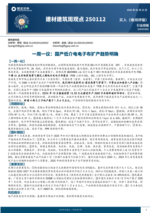 【国金证券】【20250112】建材建筑周观点:国产低介电电子布扩产趋势明确-20页