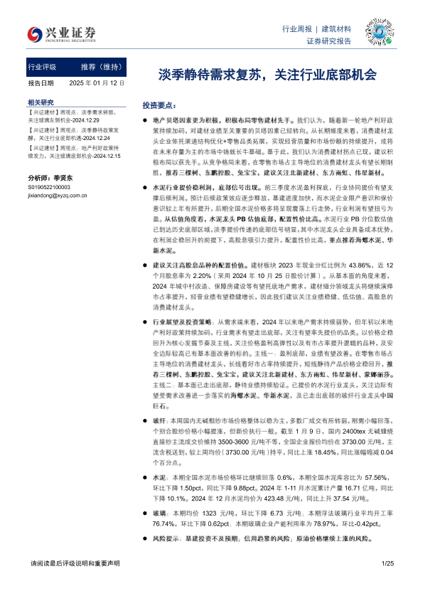 【兴业证券】【20250112】建筑材料行业周报:淡季静待需求复苏,关注行业底部机会-25页