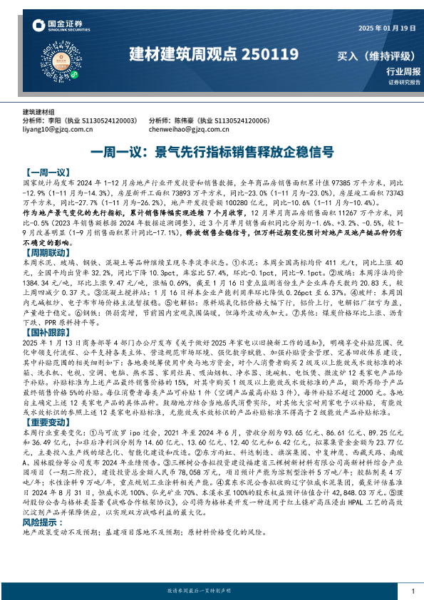 【国金证券】【20250119】建材建筑周观点:景气先行指标销售释放企稳信号-20页