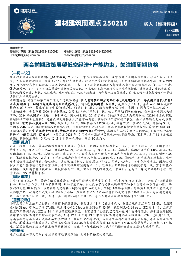 产能约束 低空经济 建材建筑 政策展望 顺周期价格