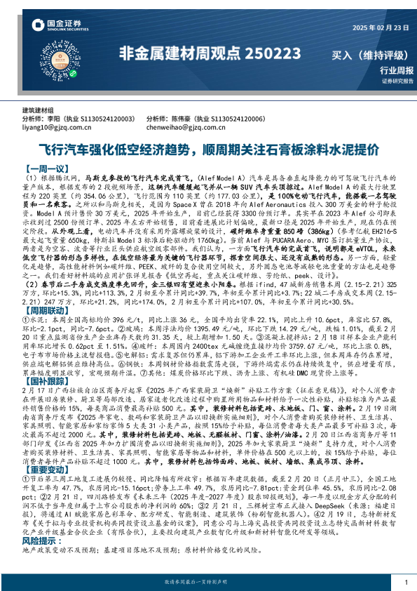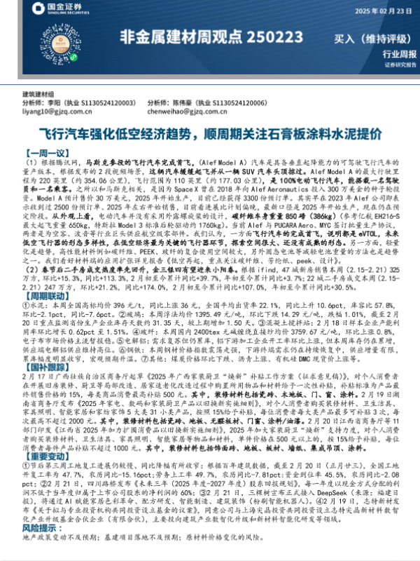 【国金证券】【20250223】非金属建材周观点:飞行汽车强化低空趋势,顺周期关注石膏板涂料水泥提价-22页