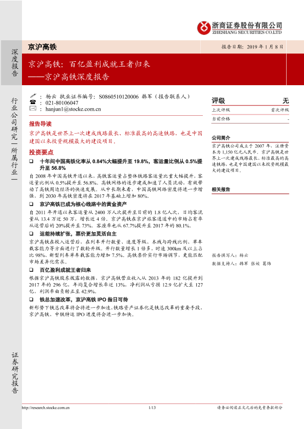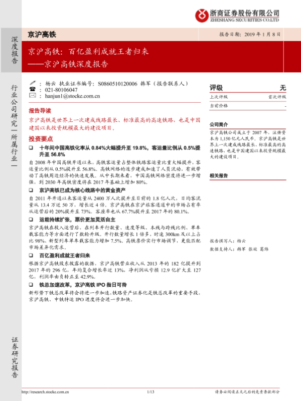 【浙商证券】【20190108】京沪高铁:百亿盈利成就王者归来-13页