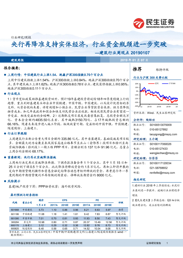 【民生证券】【20190107】建筑行业周观点:央行再降准支持实体经济,行业资金瓶颈进一步突破-14页