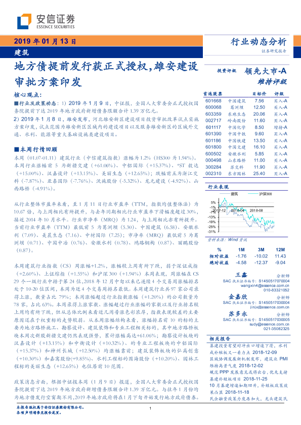 【安信证券】【20190113】建筑行业动态分析:地方债提前发行获正式授权,雄安建设审批方案印发-11页