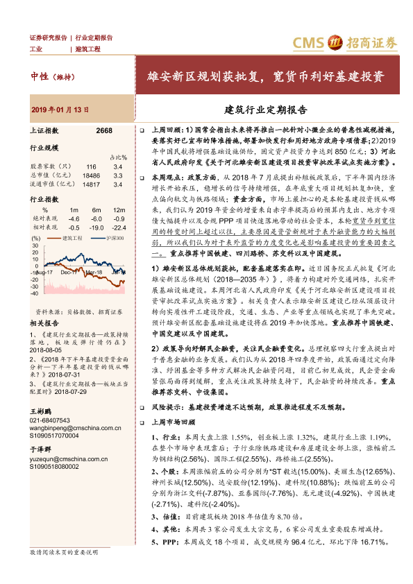 【海通证券】【20190113】建筑行业定期报告:雄安新区规划获批复,宽货币利好基建投资-23页