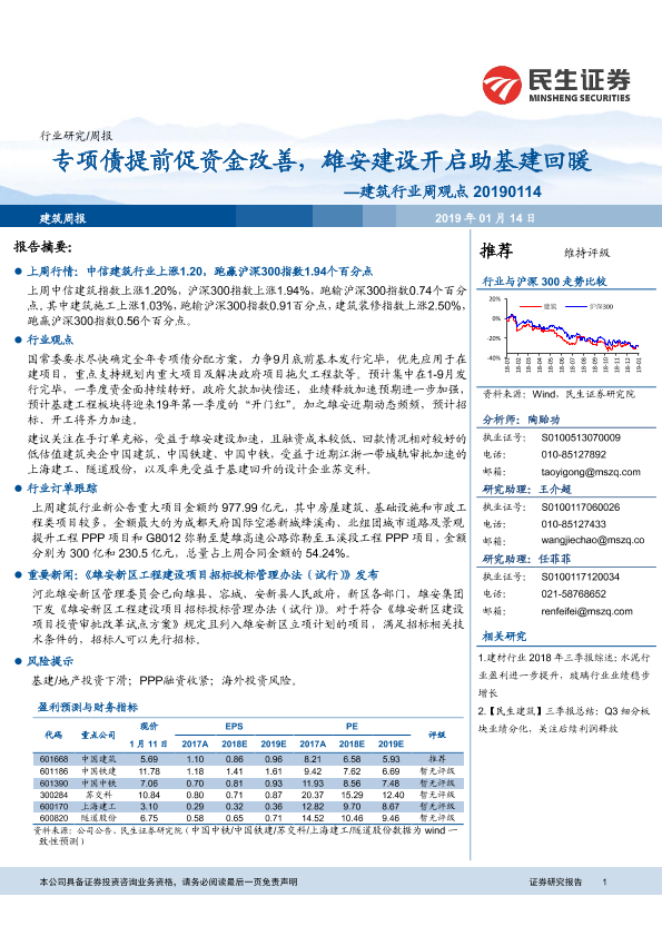 【民生证券】【20190114】建筑行业周观点:专项债提前促资金改善,雄安建设开启助基建回暖-16页