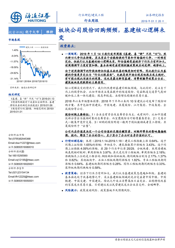 【海通证券】【20190120】建筑工程行业周报:板块公司股份回购频频,基建核心逻辑未变-10页