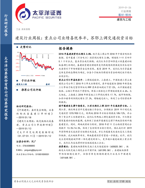 【太平洋证券】【20190126】建筑行业周报:重点公司业绩喜忧参半,苏鄂上调交通投资目标-10页
