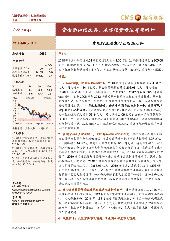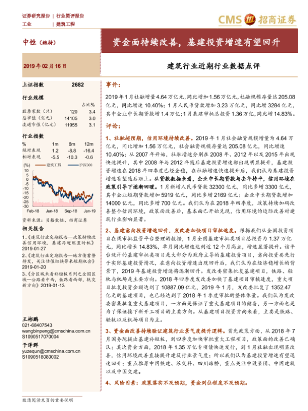 【海通证券】【20190216】建筑行业近期行业数据点评:资金面持续改善,基建投资增速有望回升-5页