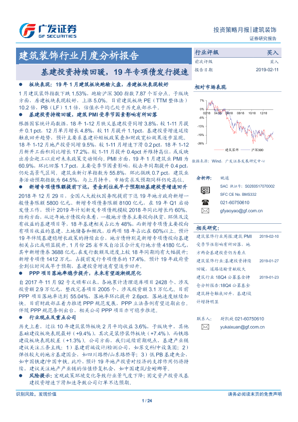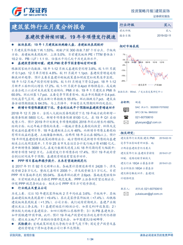 【广发证券】【20190211】建筑装饰行业月度分析报告:基建投资持续回暖,19年专项债发行提速-24页