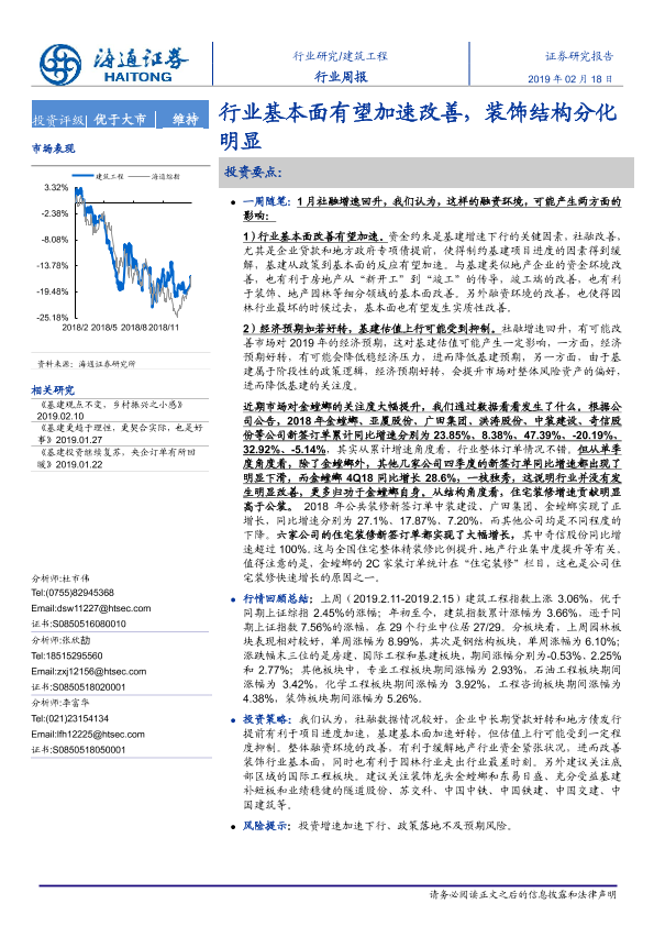 【海通证券】【20190218】建筑工程行业周报:行业基本面有望加速改善,装饰结构分化明显-9页