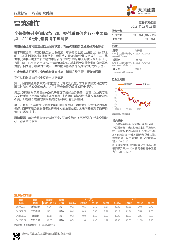 【天风证券】【20190219】建筑装饰行业研究简报:2110份问卷看清中国消费:全装修提升空间仍然可观,交付质量仍为行业主要痛点-7页