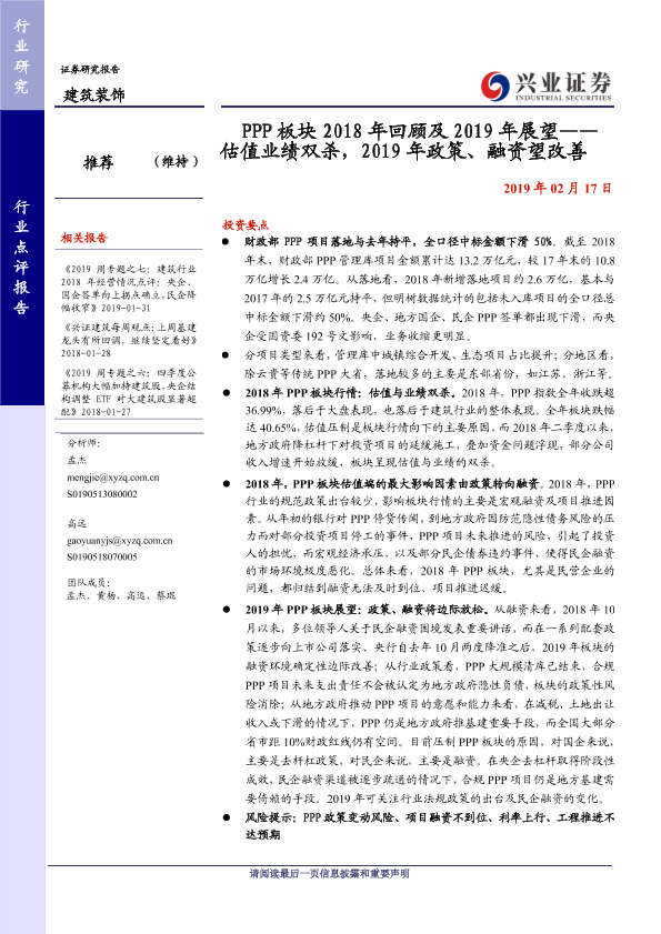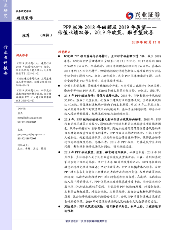 【兴业证券】【20190217】PPP板块2018年回顾及2019年展望:估值业绩双杀,2019年政策、融资望改善-19页