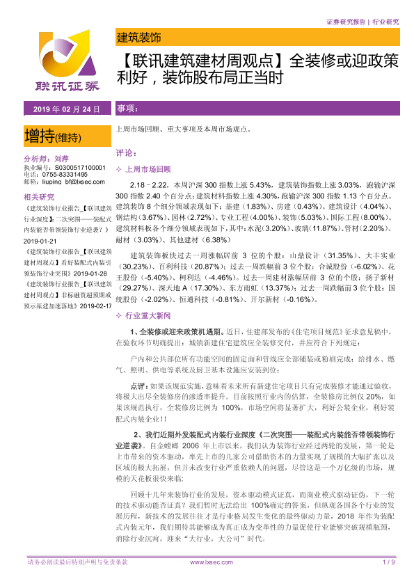 【粤开证券】【20190224】联讯建筑建材周观点:全装修或迎政策利好,装饰股布局正当时-9页
