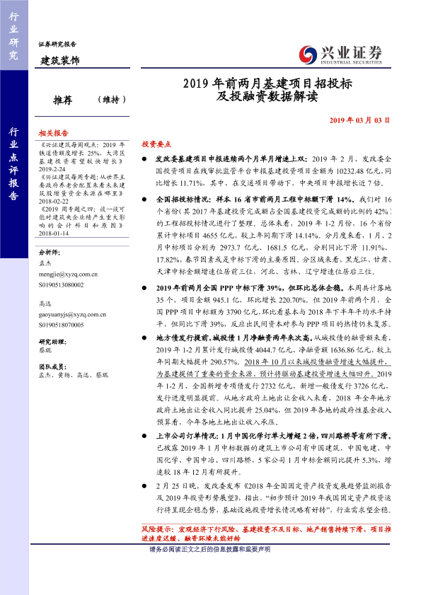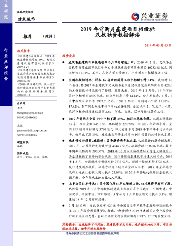 【兴业证券】【20190303】2019年前两月基建项目招投标及投融资数据解读-14页