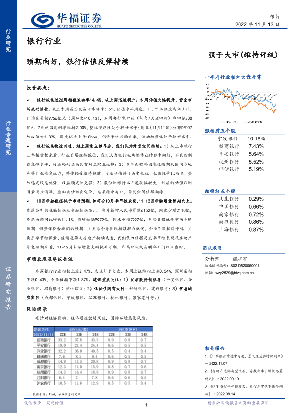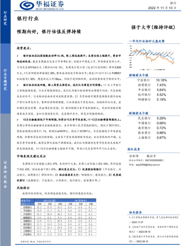 【华福证券】【20221113】银行业:预期向好,银行估值反弹持续-16页