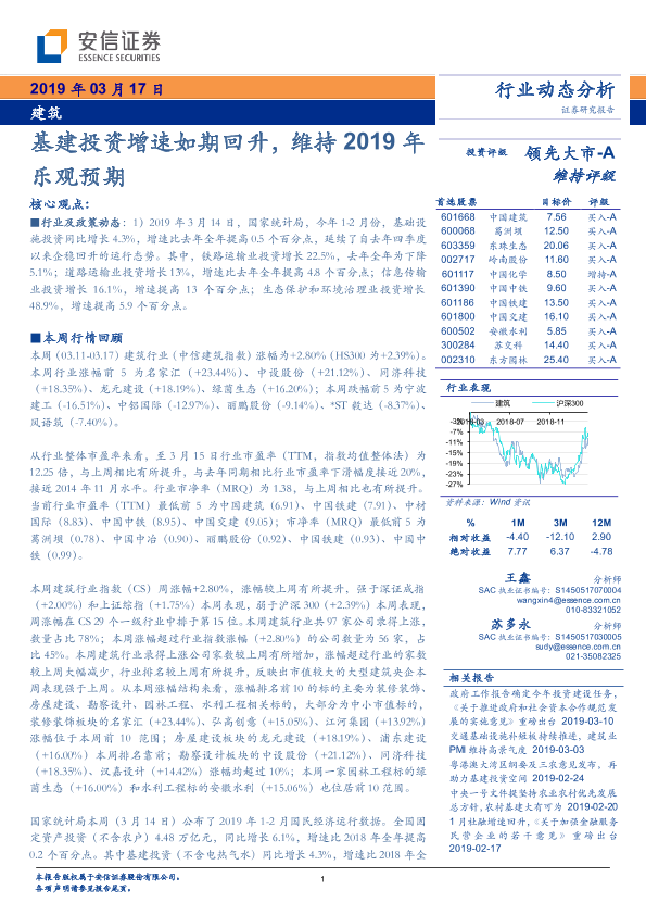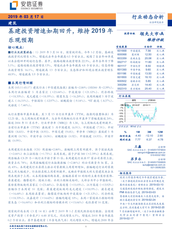 【安信证券】【20190317】建筑行业动态分析:基建投资增速如期回升,维持2019年乐观预期-9页