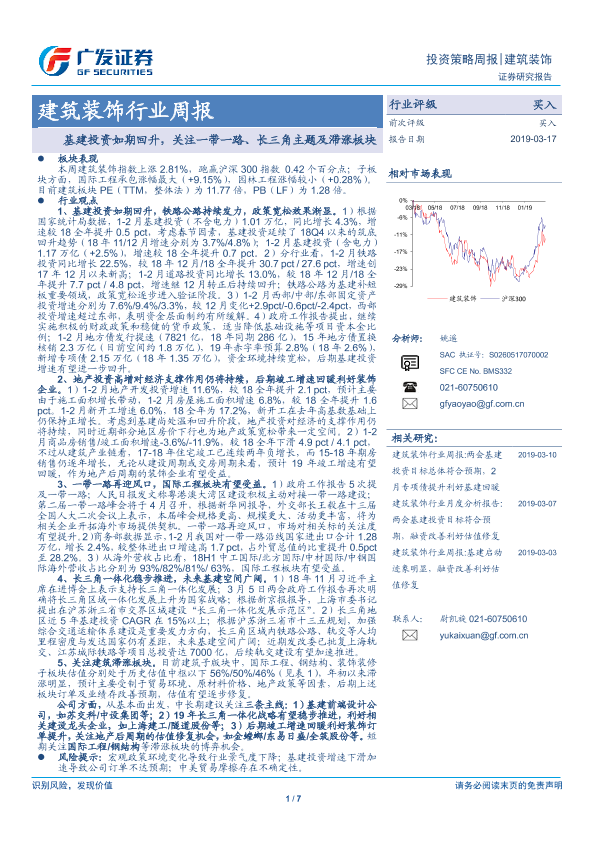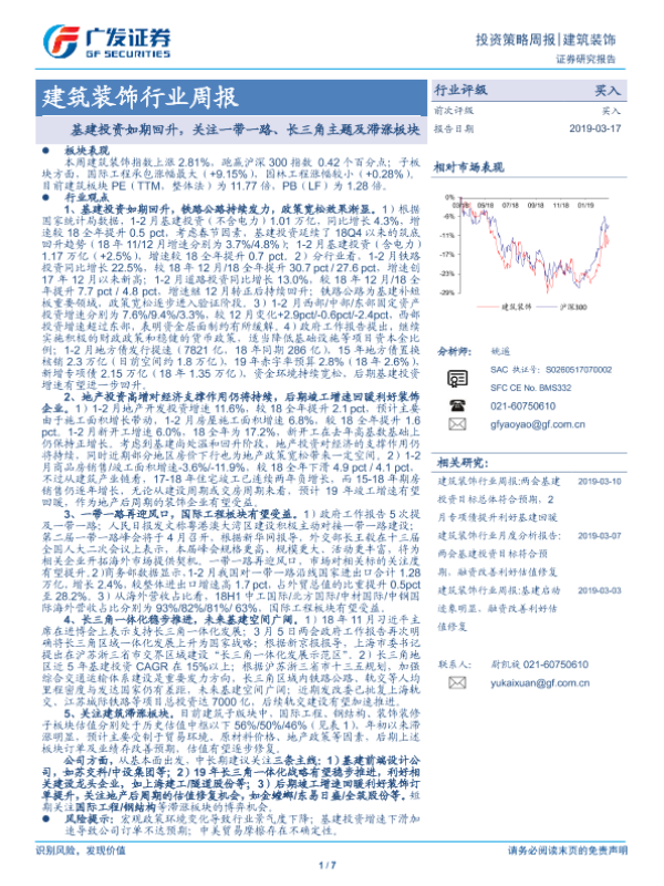 【广发证券】【20190317】建筑装饰行业周报:基建投资如期回升,关注一带一路、长三角主题及滞涨板块-7页