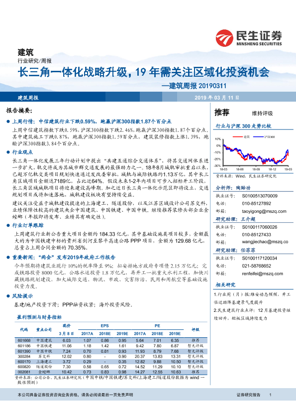 【民生证券】【20190311】建筑周报:长三角一体化战略升级,19年需关注区域化投资机会-14页