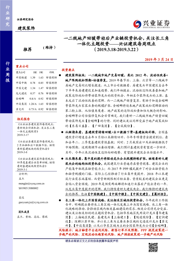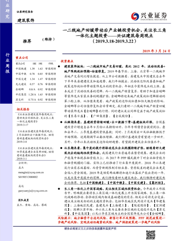 【兴业证券】【20190324】一二线地产回暖带动后产业链投资机会,关注长三角一体化主题投资-19页