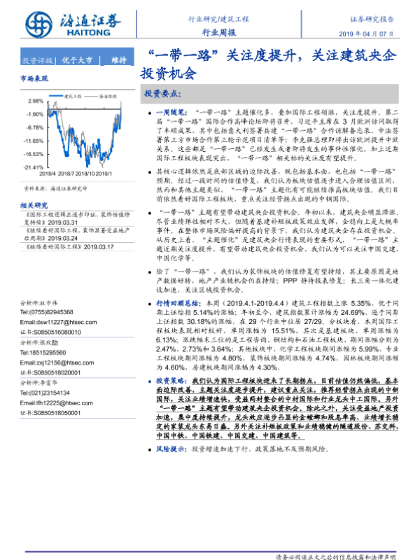 【海通证券】【20190407】建筑工程行业周报:“一带一路”关注度提升,关注建筑央企投资机会-7页
