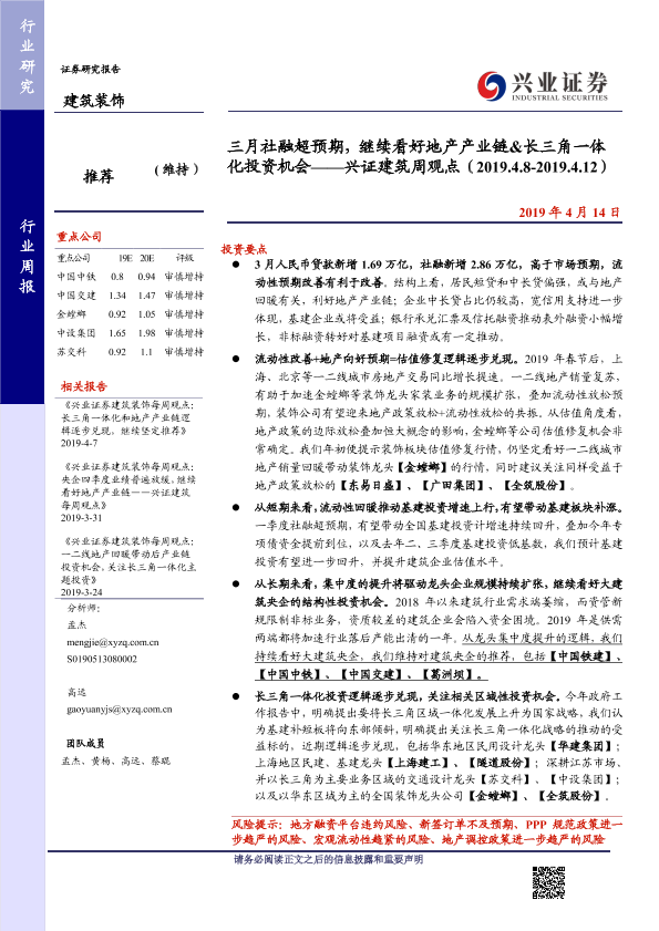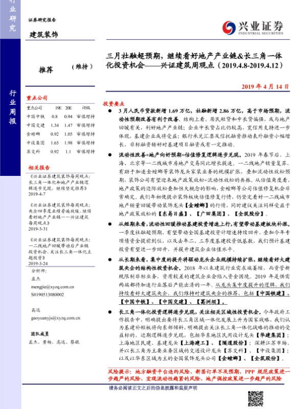 【兴业证券】【20190414】三月社融超预期,继续看好地产产业链&长三角一体化投资机会-23页