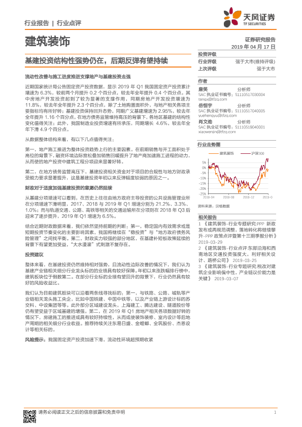 【天风证券】【20190417】建筑装饰行业点评:基建投资结构性强势仍在,后期反弹有望持续-7页