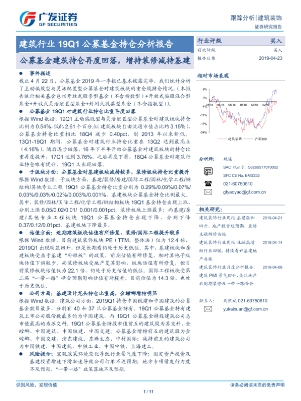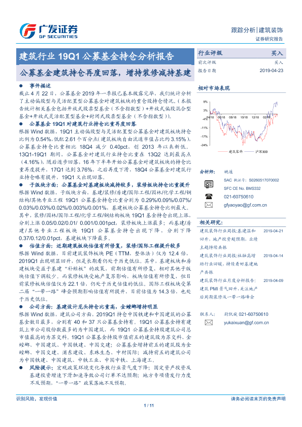 【广发证券】【20190423】建筑行业19Q1公募基金持仓分析报告:公募基金建筑持仓再度回落,增持装修减持基建-11页