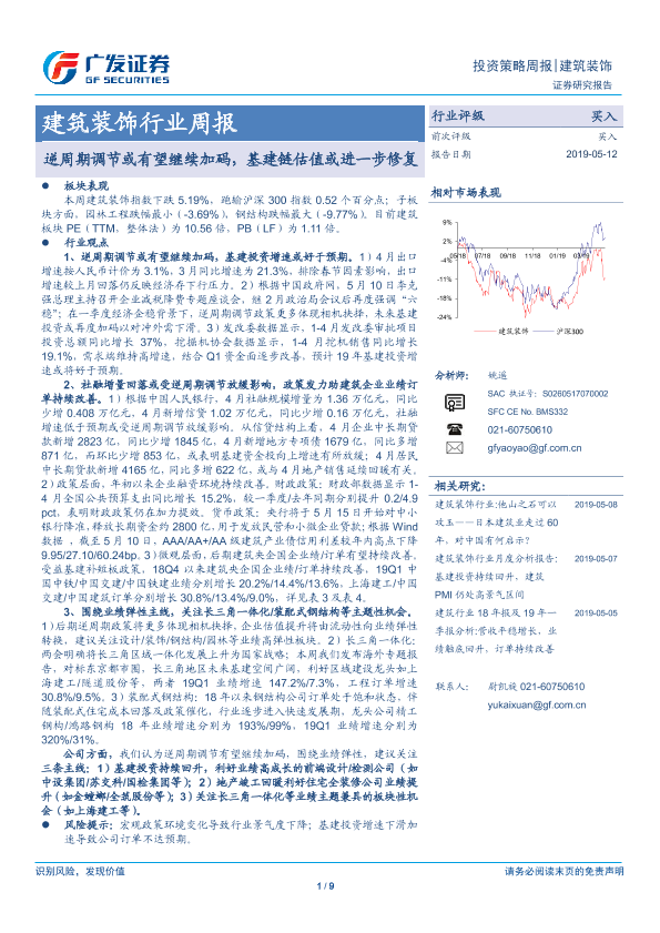 【广发证券】【20190512】建筑装饰行业周报:逆周期调节或有望继续加码,基建链估值或进一步修复-9页