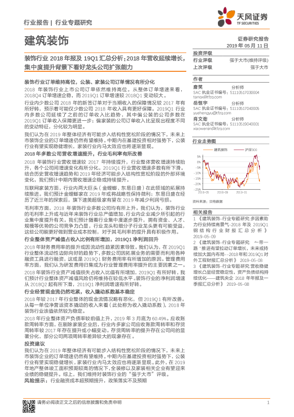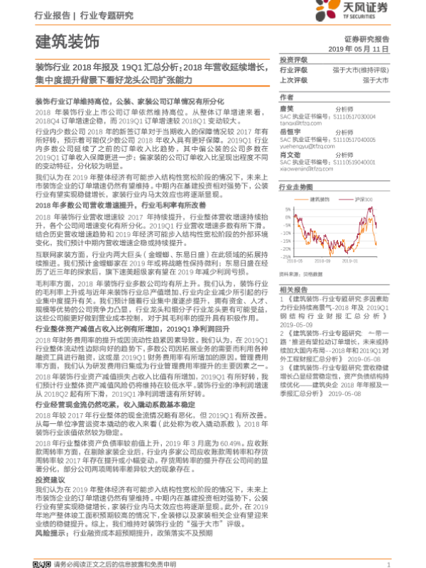 【天风证券】【20190511】装饰行业2018年报及19Q1汇总分析:2018年营收延续增长,集中度提升背景下看好龙头公司扩张能力-14页