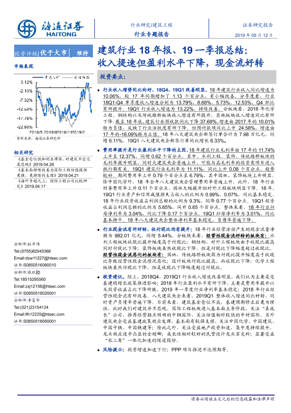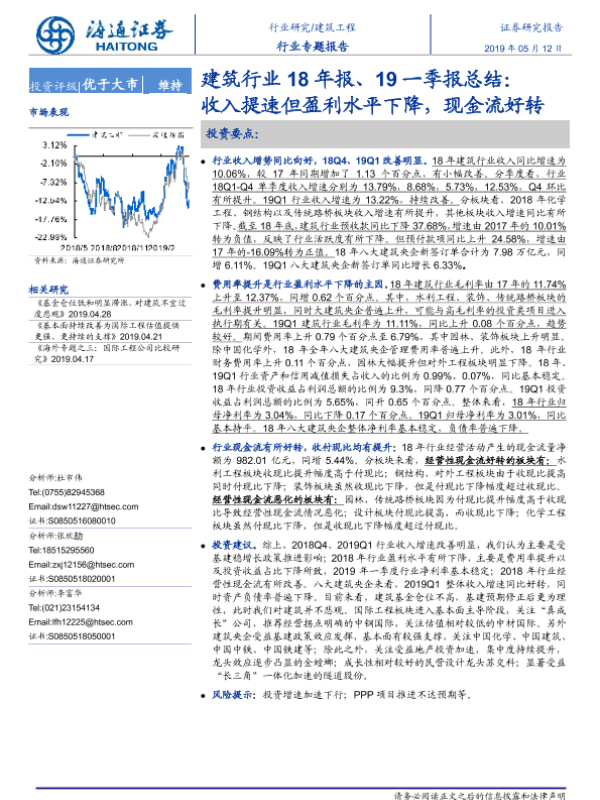 【海通证券】【20190512】建筑行业18年报、19一季报总结:收入提速但盈利水平下降,现金流好转-24页