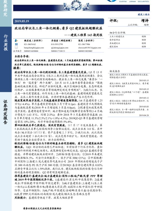 【国泰君安证券】【20190519】政治局审议长三角一体化纲要,看多Q2建筑板块超额收益-6页