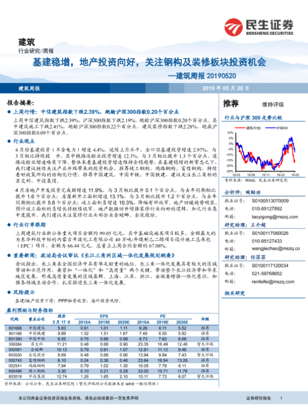 【民生证券】【20190520】建筑周报:基建稳增,地产投资向好,关注钢构及装修板块投资机会-16页
