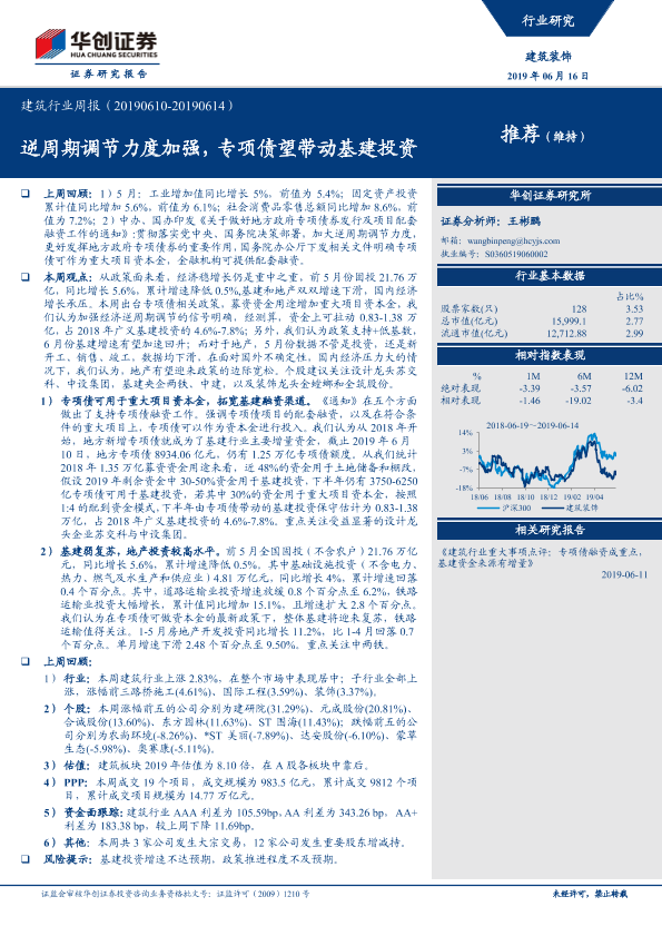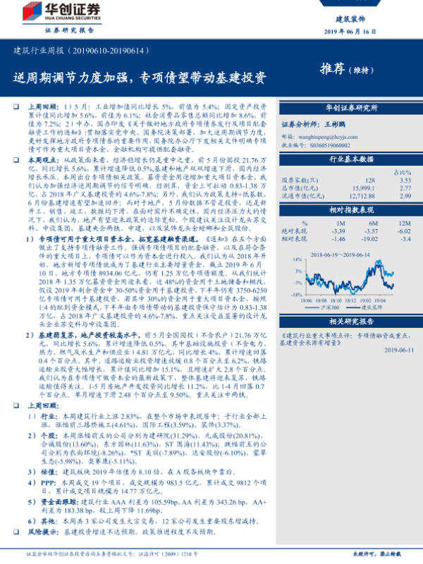 【华创证券】【20190616】建筑行业周报:逆周期调节力度加强,专项债望带动基建投资-20页