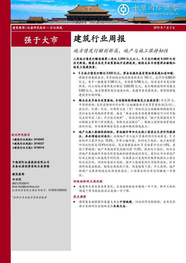 【中银证券】【20190703】建筑行业周报:地方债发行额创新高,地产与施工保持韧性-15页