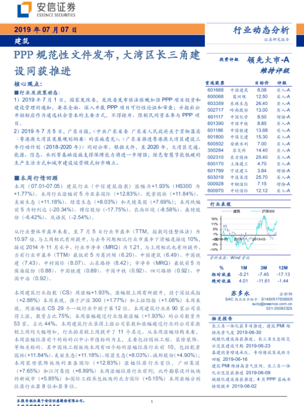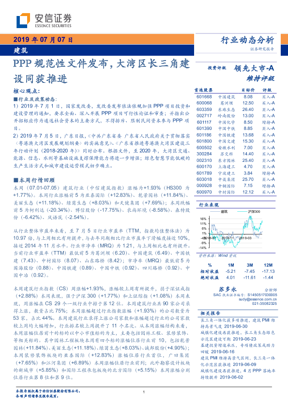 【安信证券】【20190707】建筑行业动态分析:PPP规范性文件发布,大湾区长三角建设同获推进-10页