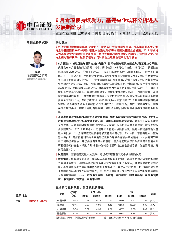 【中信证券】【20190715】建筑行业周报:6月专项债持续发力,基建央企或将分拆进入发展新阶段-31页