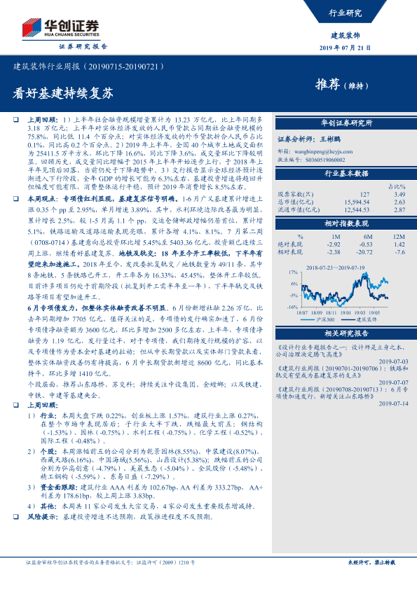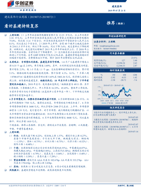 【华创证券】【20190721】建筑装饰行业周报:看好基建持续复苏-19页