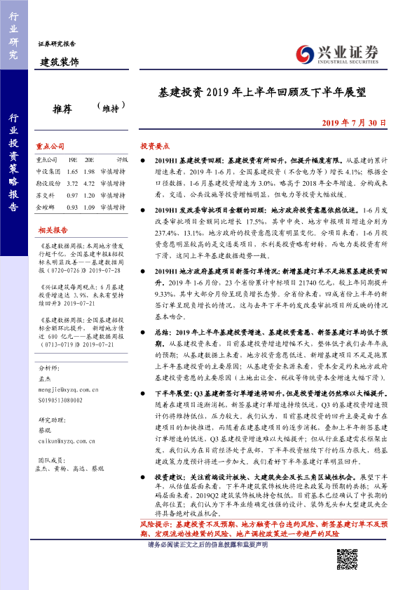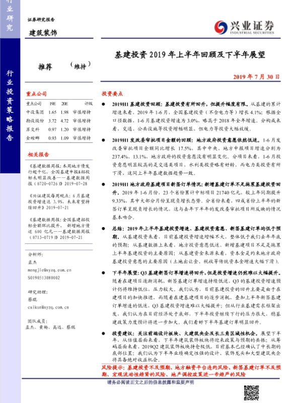 2019年上半年 下半年展望 基建投资 建筑装饰 投资策略