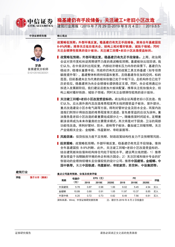 【中信证券】【20190805】建筑行业周报:稳基建仍有手段储备;关注竣工+老旧小区改造-31页