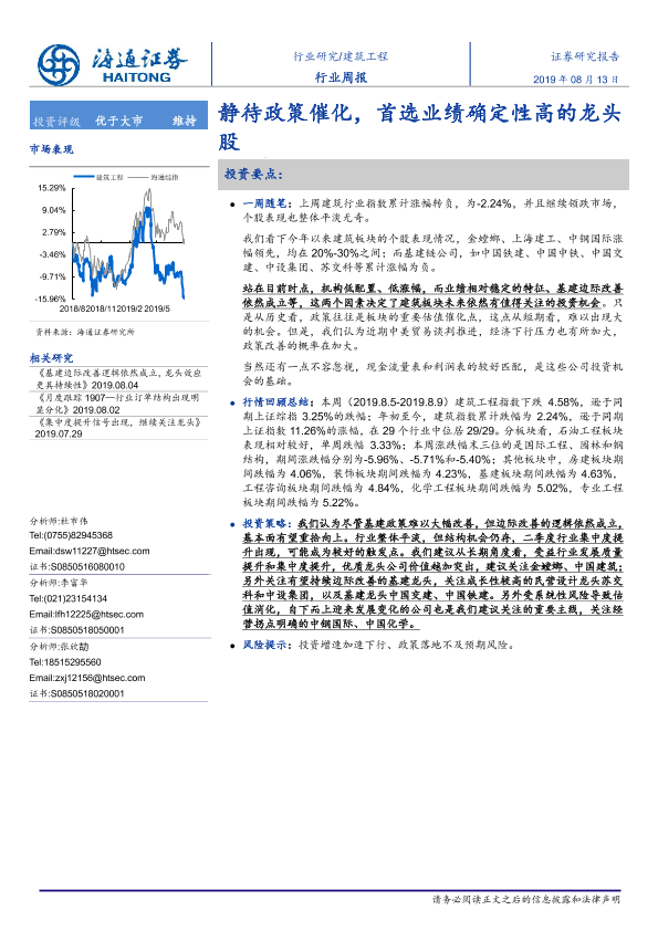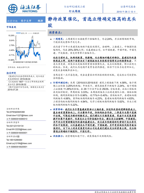 【海通证券】【20190813】建筑工程行业周报:静待政策催化,首选业绩确定性高的龙头股-7页