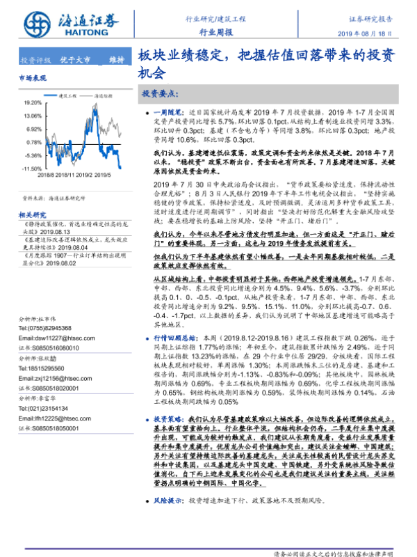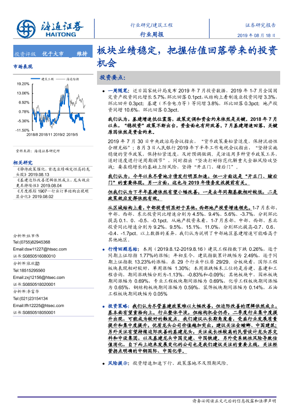 【海通证券】【20190818】建筑工程行业周报:板块业绩稳定,把握估值回落带来的投资机会-7页
