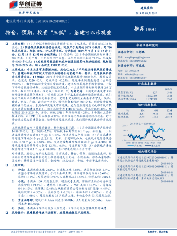 【华创证券】【20190825】建筑装饰行业周报:持仓、预期、投资“三低”,基建可以乐观些-20页